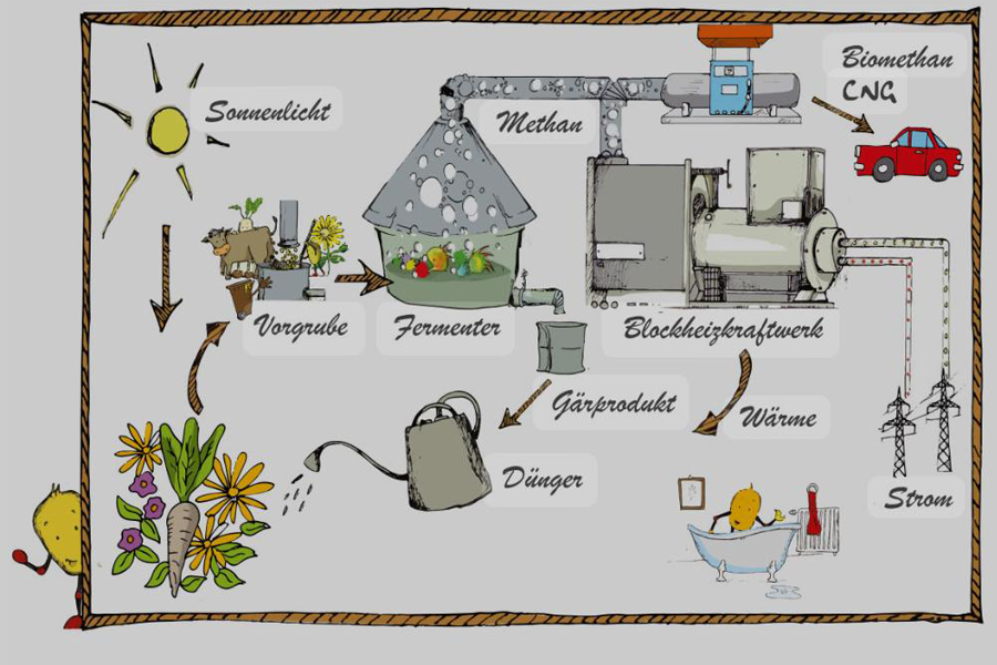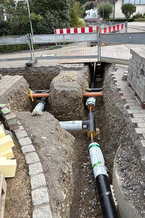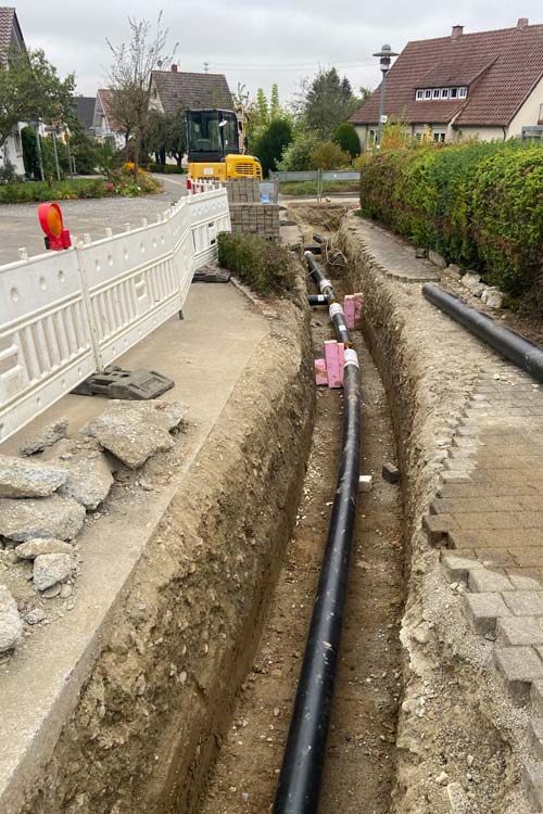 Als Nahwärme bezeichnet man die zentrale Wärmeversorgung mehrerer Gebäude. Unsere Wärme wird in einer Energiezentrale erzeugt. Unsere Blockheizkraftwerke (BHKW) werden mit Biogas betrieben und erzeugen erneuerbaren Strom und Wärme. Eine wichtige Rolle spielt hierbei das Kühlwasser der BHKW, dass die Motoren kühlt. Nachdem es die Motoren durchströmt hat, gibt es die aufgenommene Wärme als Nebenprodukt an das Wärmenetz ab. Diese Wärme wird dann über ein gut isoliertes Rohrsystem zu den angeschlossenen Haushalten transportiert. Hier kommt die Wärme über eine Übergabestation in das jeweilige Heizsystem im Gebäude. Diese Station sorgt dafür, dass die Wärme effizient und sicher an die Heizkörper oder Fußbodenheizung weitergegeben wird. Das abgekühlte Wasser hingegen fließt zurück in den Kreislauf der BHKW, um erneut erhitzt zu werden.